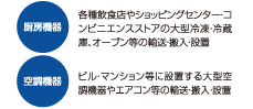 大型冷凍・冷蔵庫、オーブンといった厨房機器や、空調機器などの輸送もおまかせください。専門スタッフが、輸送だけでなく、搬入や設置工事まで迅速に行います。
